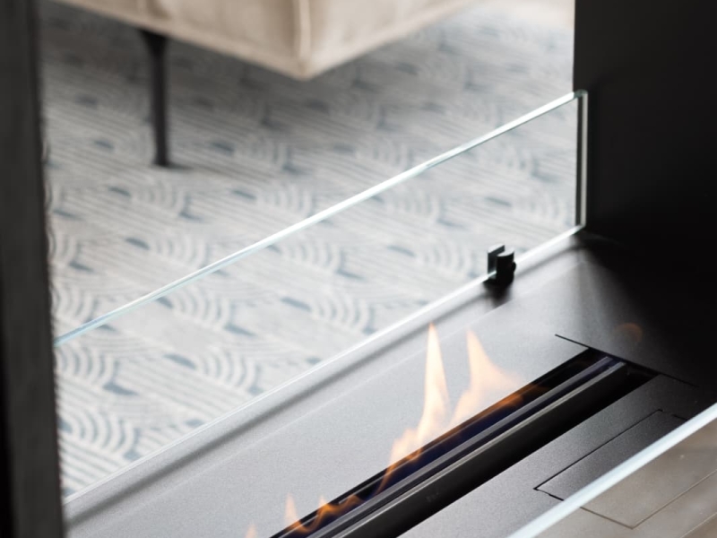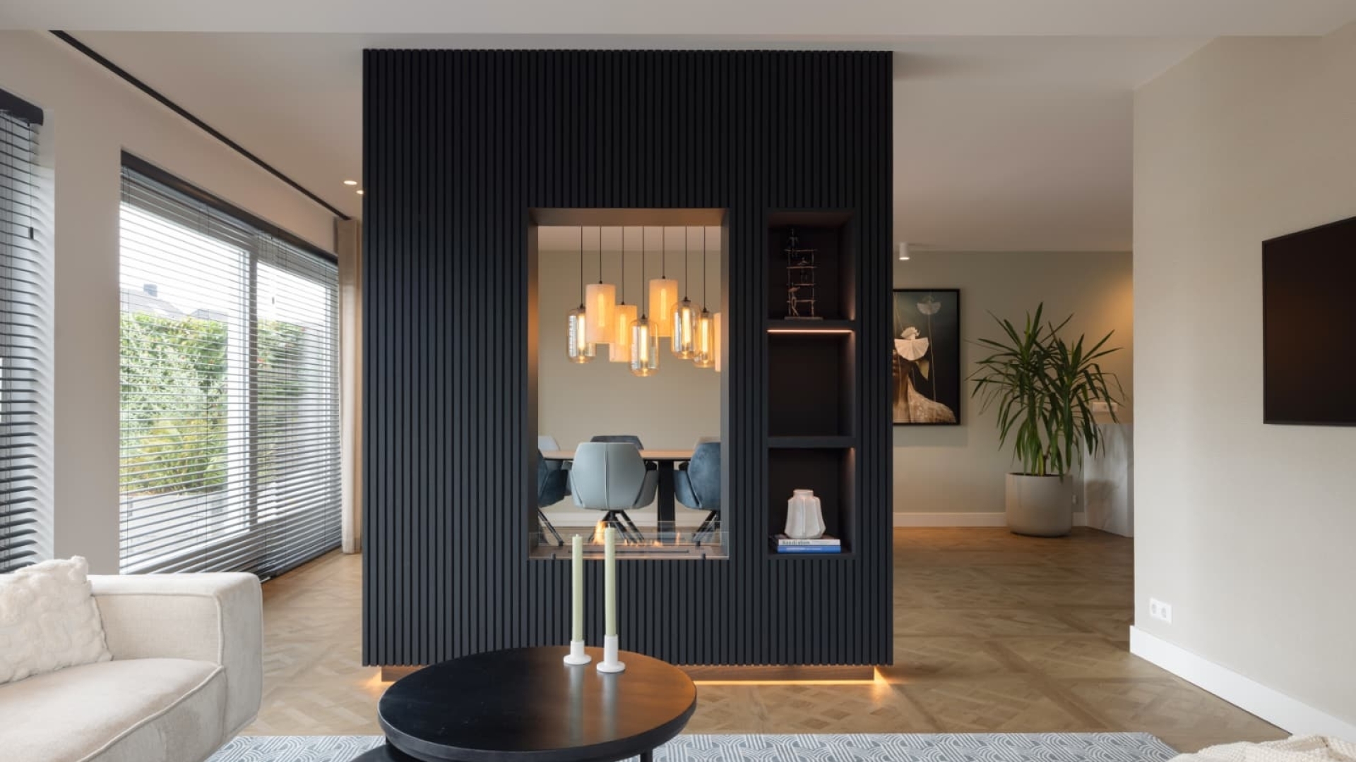 We hebben de functies omgedraaid en er een transparante roomdivider met doorkijkhaard tussen geplaatst die de woonkamer en eetkamer op speelse wijze van elkaar scheidt zonder het open karakter te verliezen