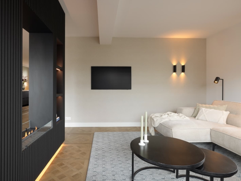 Door de donkere afwerking van de maatwerk keuken, haard, kozijnen en zwarte aluminium jaloezieën geeft het geheel meer pit.